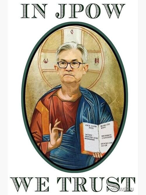 An enterprising entrepreneur did a comedic graphic of Federal Reserve Chairman Jerome Powell captioned: “IN JPOW WE TRUST.”